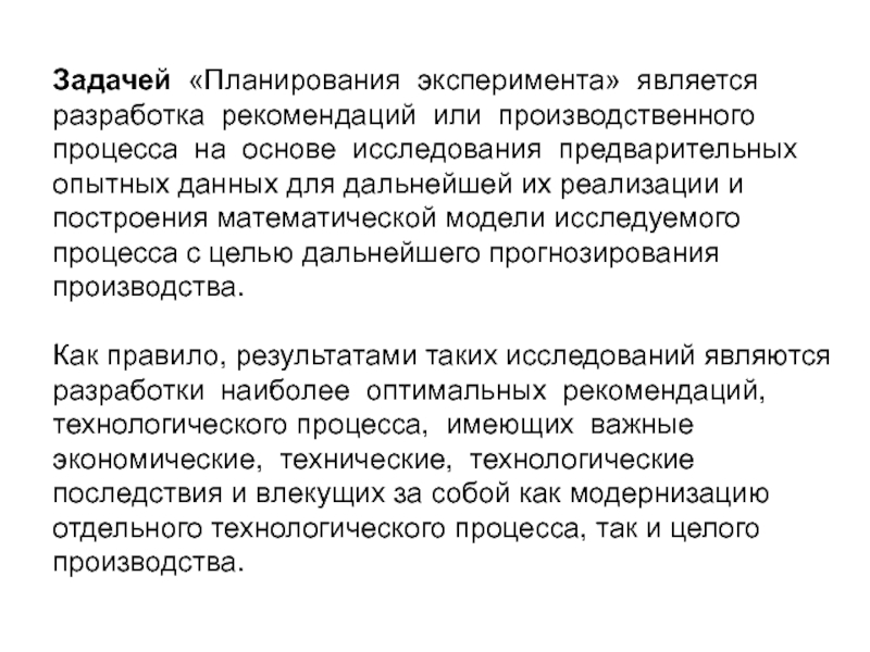 Слайд 2Задачей «Планирования эксперимента» является разработка рекомендаций или производственного процесса на