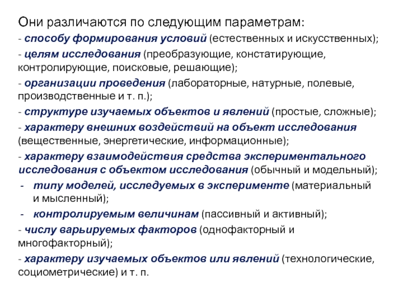 проведения (лабораторные, натурные, полевые, производственные и т. п.);