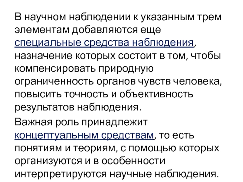 Важная роль принадлежит концептуальным средствам, то есть понятиям и теориям, с помощью которых организуются и в особенности интерпретируются научные наблюдения.