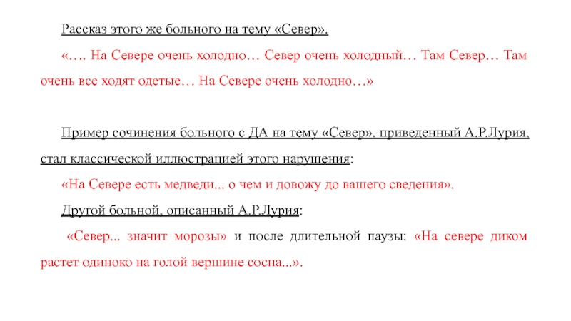 Пример сочинения больного с ДА на тему «Север», приведенный А.Р.Лурия, стал классической иллюстрацией этого нарушения: