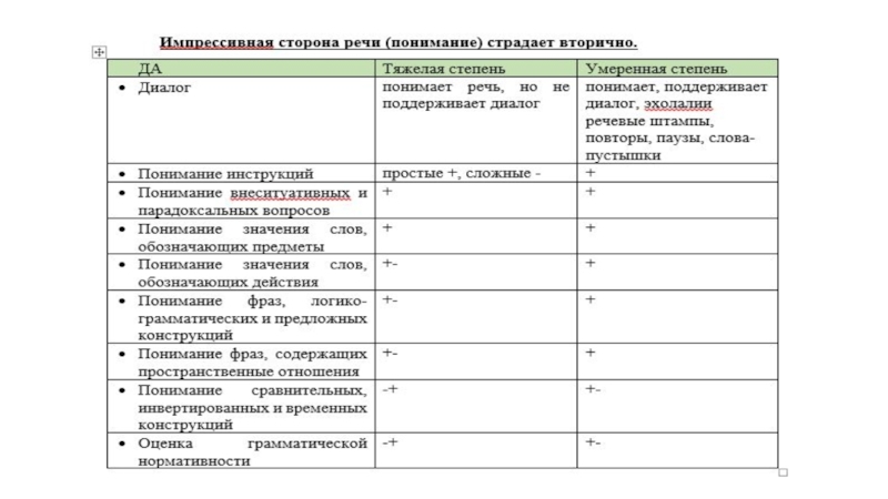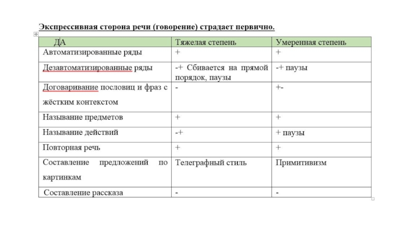 первично сохранны: понимание, речевые штампы, повторная речь, чтение
