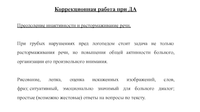 Рисование, лепка, оценка искаженных изображений, слов, фраз; ситуативный, эмоционально значимый для больного диалог; простые (возможно жестовые) ответы на вопросы по тексту.