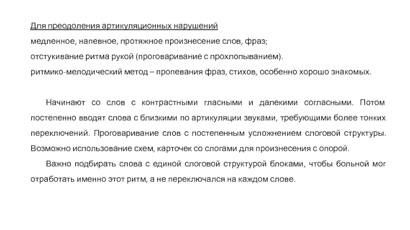 Важно подбирать слова с единой слоговой структурой блоками, чтобы больной мог отработать именно этот ритм, а не переключался на каждом слове.
