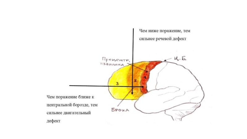 Слайд 36Это речевое нарушение наблюдается при поражении выше и кпереди от