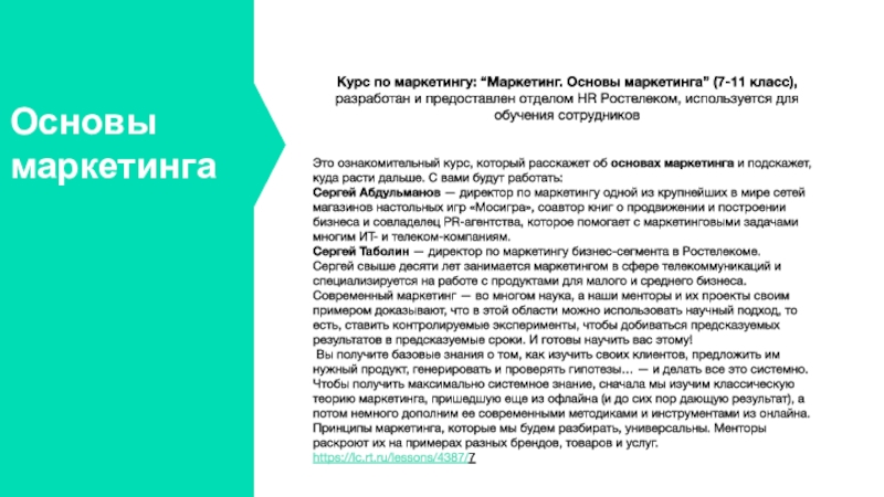 Курс по маркетингу: “Маркетинг. Основы маркетинга” (7-11 класс), разработан