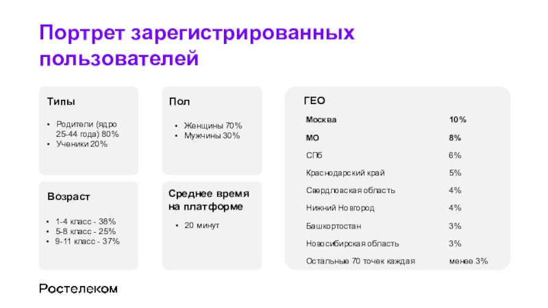 20% пользователей - Москва и МО, остальные регионы России распределены равномерно от 2-3 до 7% каждый регион.