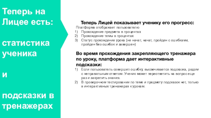 Во время прохождения закрепляющего тренажера по уроку, платформа дает интерактивные подсказки:
