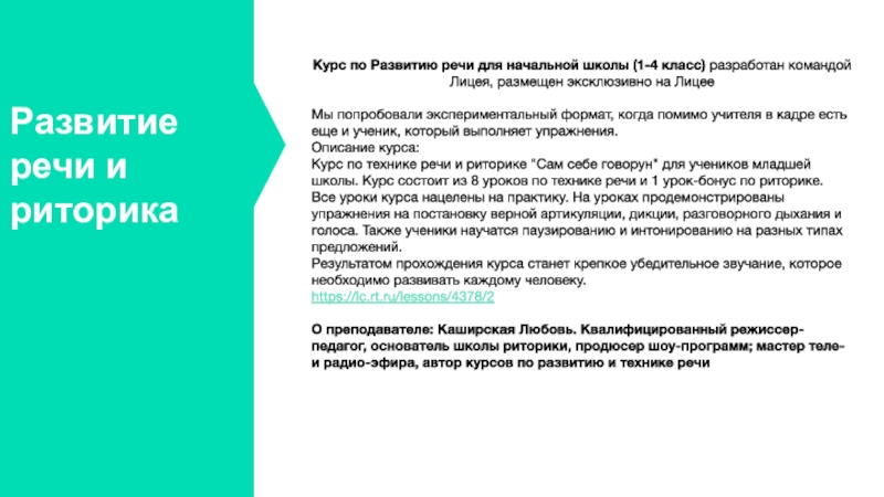 Все уроки курса нацелены на практику. На уроках продемонстрированы упражнения на постановку верной артикуляции, дикции, разговорного дыхания и голоса. Также ученики научатся паузированию и интонированию на разных типах предложений.