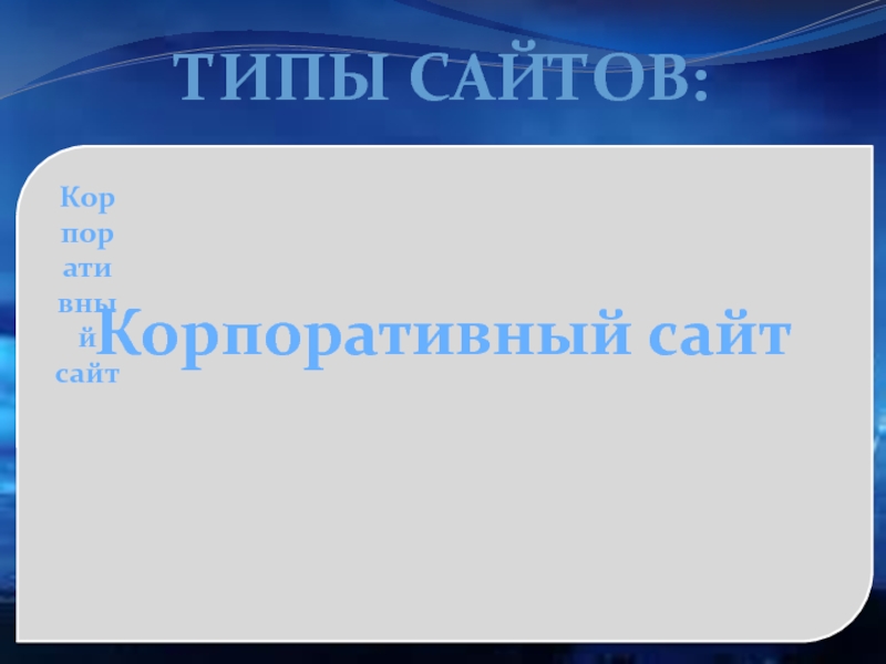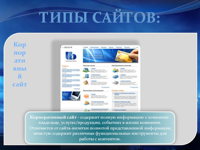 Типы сайтов:Корпоративный сайтКорпоративный сайт - содержит полную информацию о компании-владельце, услугах/продукции, событиях в жизни компании. Отличается от