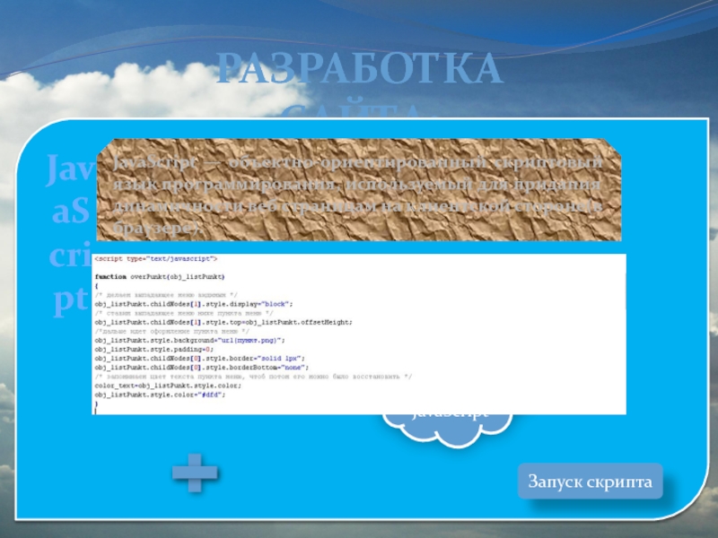 Разработка сайта:JavaScriptЗапуск скриптаJavaScript — объектно-ориентированный скриптовый язык программирования, используемый для придания динамичности веб страницам на клиентской стороне(в