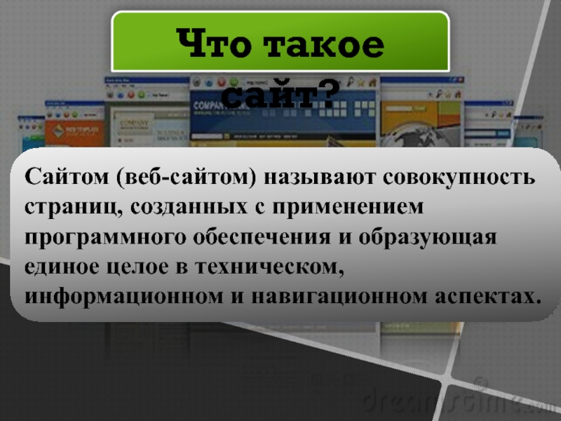 Что такое сайт?Сайтом (веб-сайтом) называют совокупность страниц, созданных с применением программного обеспечения и образующаяединое целое в техническом,