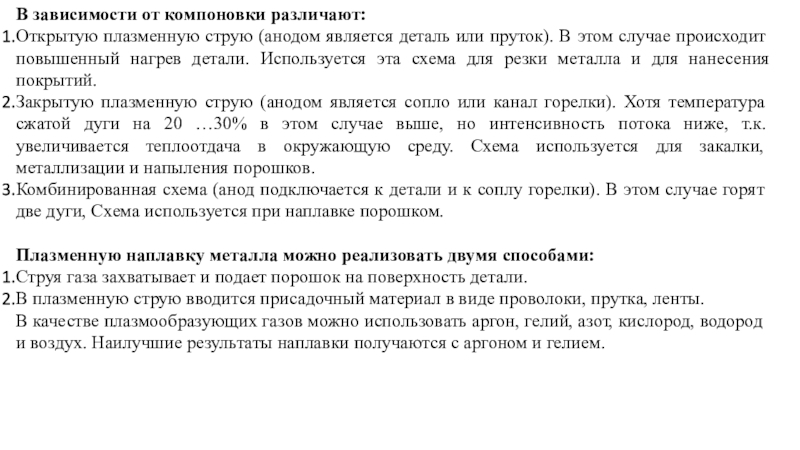 Закрытую плазменную струю (анодом является сопло или канал горелки). Хотя температура сжатой дуги на 20 …30% в этом случае выше, но интенсивность потока ниже, т.к. увеличивается теплоотдача в окружающую среду. Схема используется для закалки, металлизации и напыления порошков.