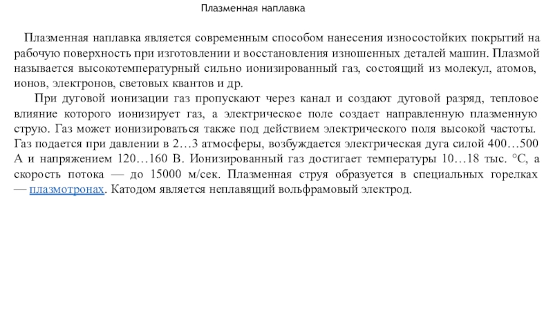 В плазменную струю вводится присадочный материал в виде проволоки, прутка, ленты.