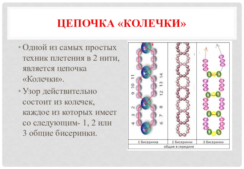 Цепочка «Колечки»Одной из самых простых техник плетения в 2 нити, является цепочка «Колечки». Узор действительно состоит из