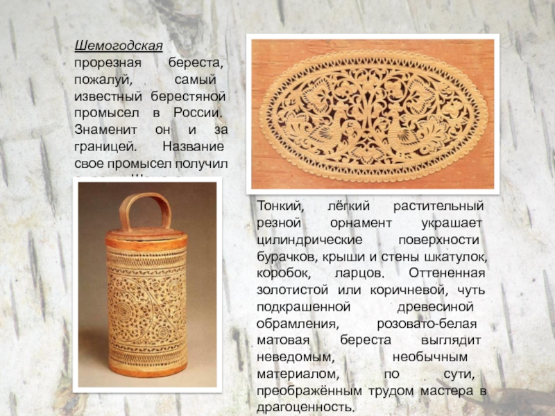 Тонкий, лёгкий растительный резной орнамент украшает цилиндрические поверхности бурачков, крыши и стены шкатулок, коробок, ларцов. Оттененная золотистой или коричневой, чуть подкрашенной древесиной обрамления, розовато-белая матовая береста выглядит неведомым, необычным материалом, по сути, преображённым трудом мастера в драгоценность.