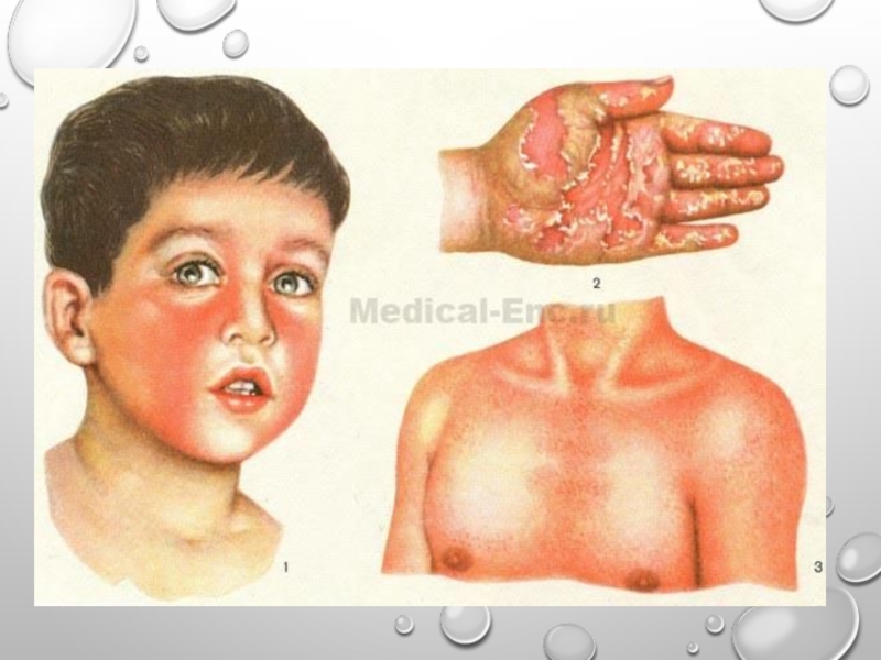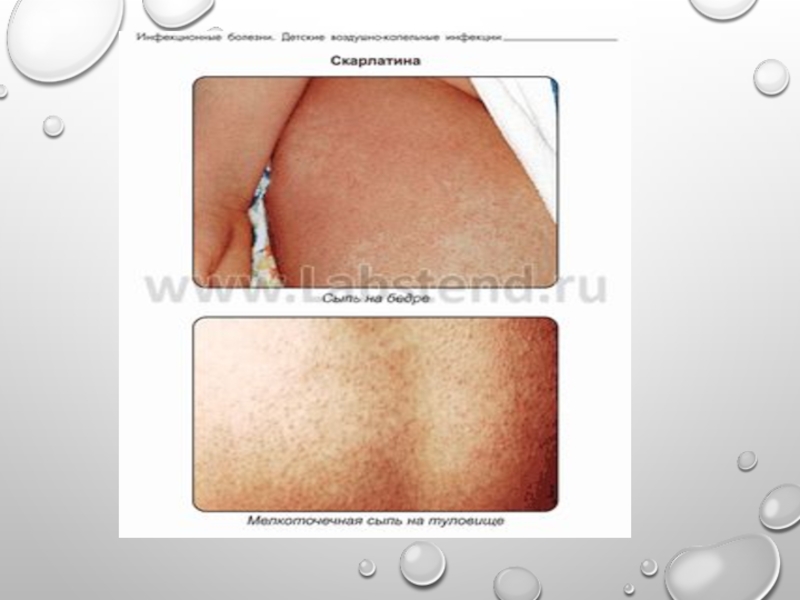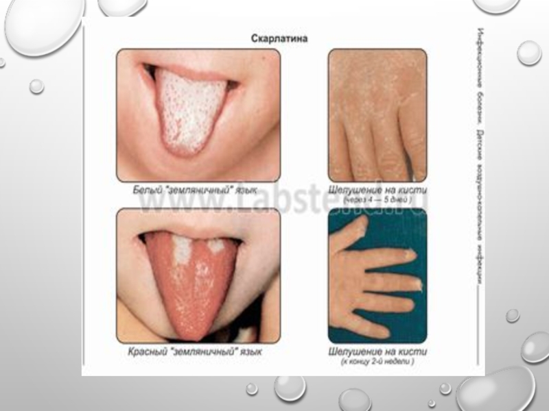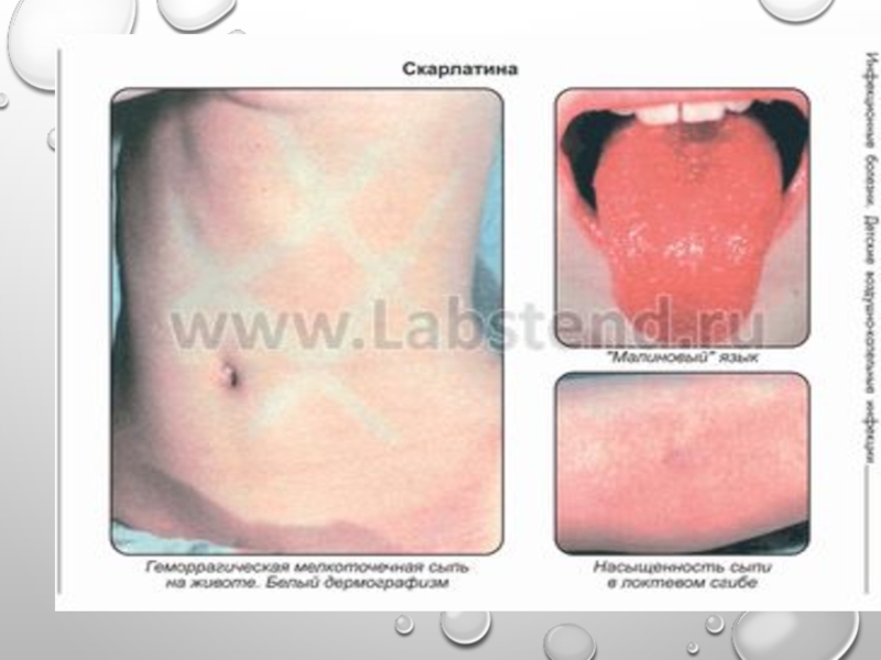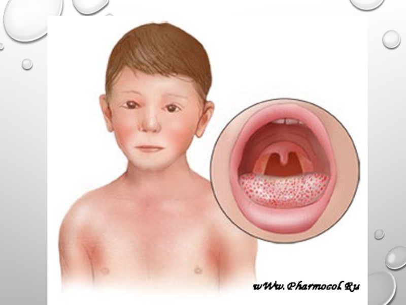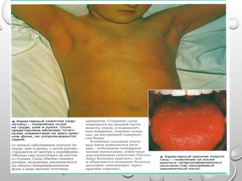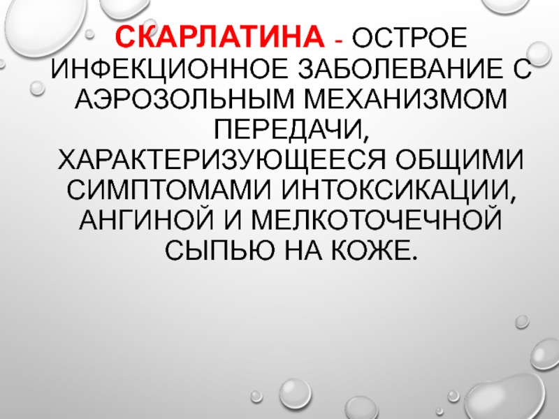 Слайд 45Скарлатина - острое инфекционное заболевание с аэрозольным механизмом передачи, характеризующееся