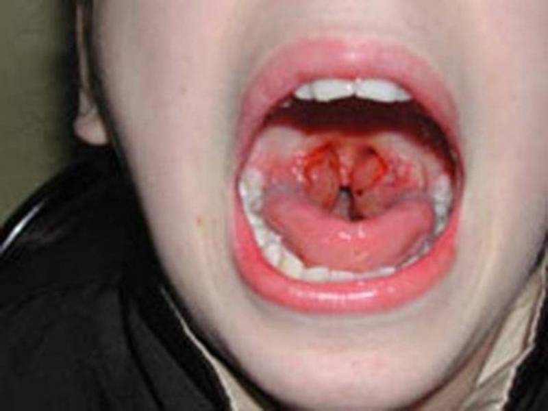 настолько резко. что миндалины соприкасаются друг с другом, отодвигая назад язычок. голос приобретает носовой оттенок, возникает неприятный запах изо рта. Налеты на миндалинах грязно-белые. Регионарные лимфоузлы резко увеличены. Отмечается отечность окружающей клетчатки.