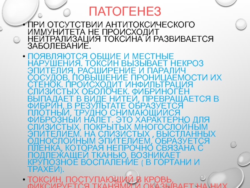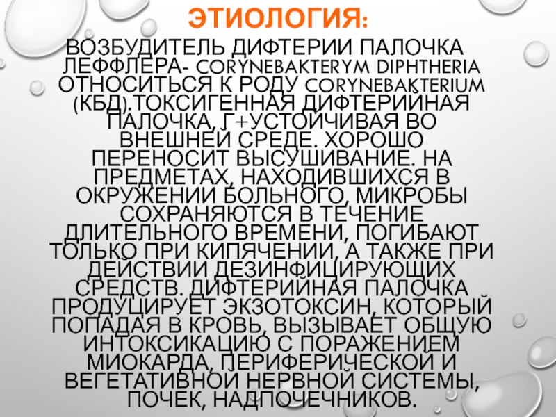 На предметах, находившихся в окружении больного, микробы сохраняются в течение длительного времени, погибают только при кипячении, а также при действии дезинфицирующих средств. Дифтерийная палочка продуцирует экзотоксин, который попадая в кровь, вызывает общую интоксикацию с поражением миокарда, периферической и вегетативной нервной системы, почек, надпочечников.