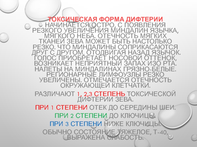 Различают 1, 2,3 степень токсической дифтерии зева.