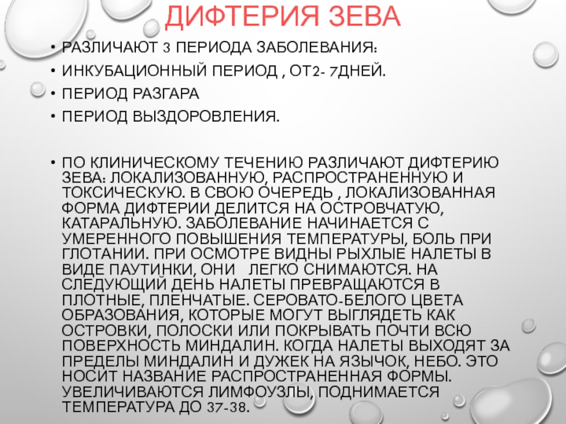 По клиническому течению различают дифтерию зева: локализованную, распространенную и токсическую.