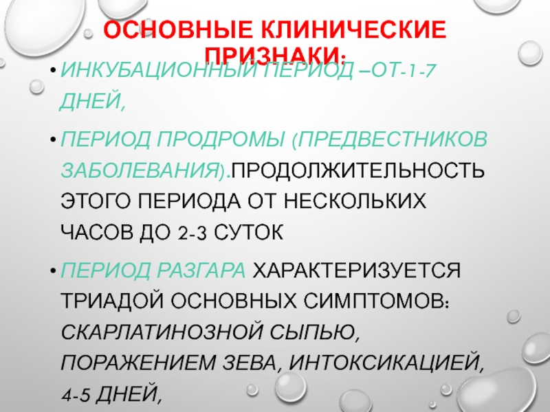 триадой основных симптомов: скарлатинозной сыпью, поражением зева, интоксикацией, 4-5 дней,