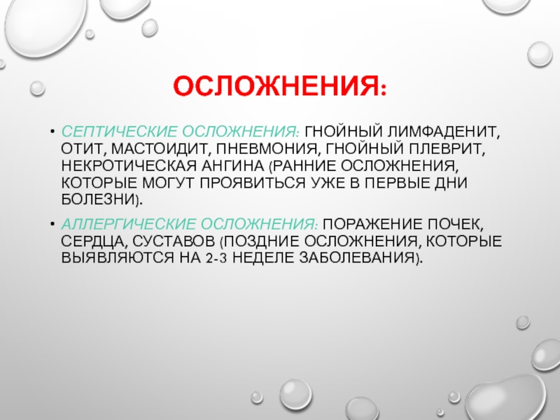 Септические осложнения: гнойный лимфаденит, отит, мастоидит, пневмония, гнойный плеврит, некротическая