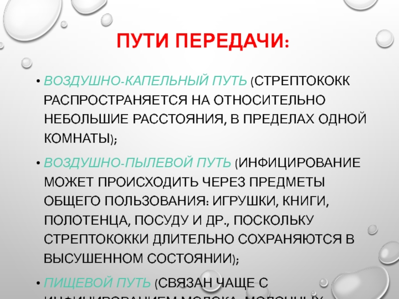 Воздушно-капельный путь (стрептококк распространяется на относительно небольшие расстояния, в