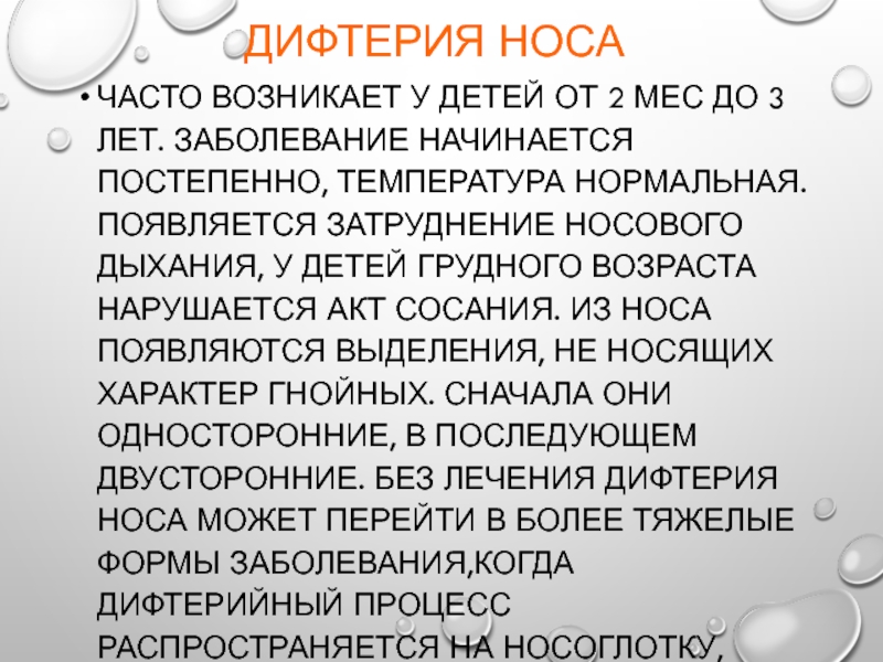 у детей грудного возраста нарушается акт сосания. Из носа появляются выделения, не носящих характер гнойных. Сначала они односторонние, в последующем двусторонние. Без лечения дифтерия носа может перейти в более тяжелые формы заболевания,когда дифтерийный процесс распространяется на носоглотку, гортань.