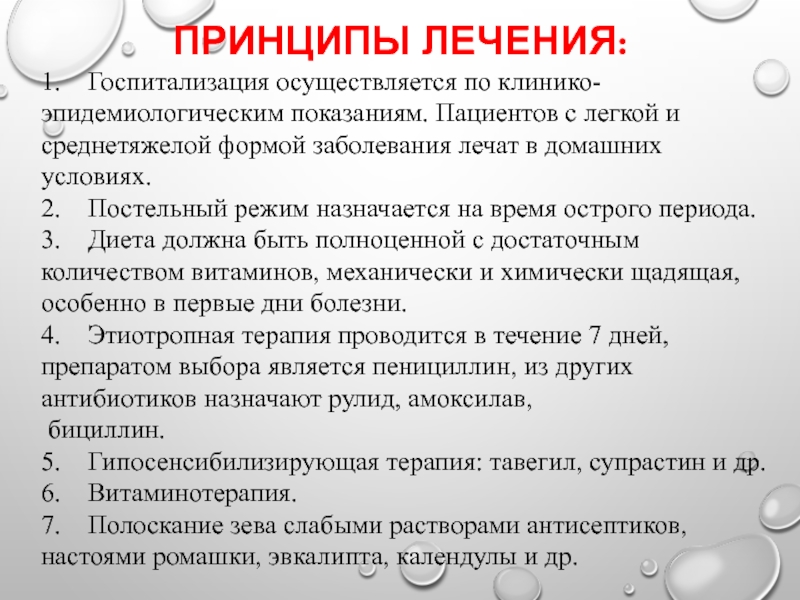 4. Этиотропная терапия проводится в течение 7 дней, препаратом выбора является пенициллин, из других антибиотиков назначают рулид, амоксилав,