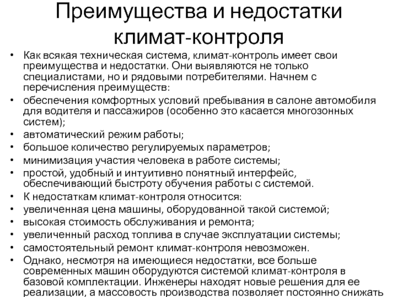 Однако, несмотря на имеющиеся недостатки, все больше современных машин оборудуются системой климат-контроля в базовой комплектации. Инженеры находят новые решения для ее реализации, а массовость производства позволяет постоянно снижать цену.