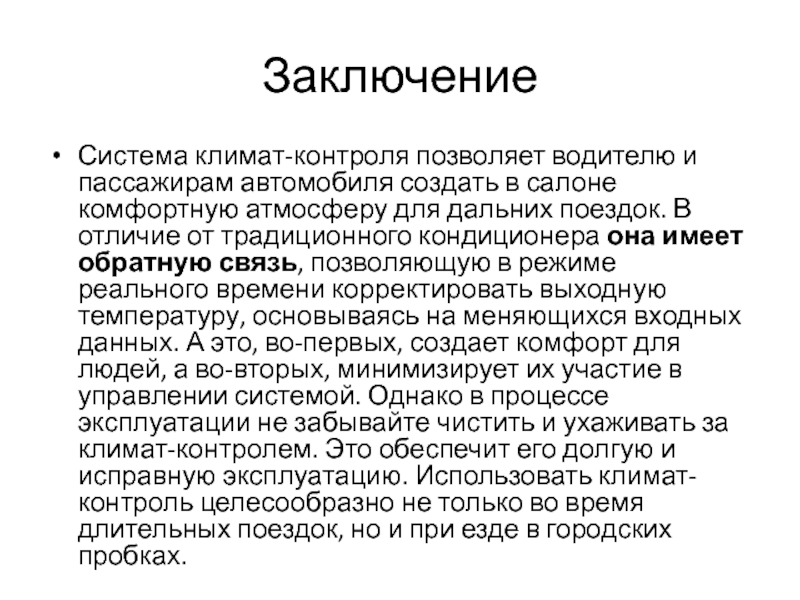 имеет обратную связь, позволяющую в режиме реального времени корректировать выходную температуру, основываясь на меняющихся входных данных. А это, во-первых, создает комфорт для людей, а во-вторых, минимизирует их участие в управлении системой. Однако в процессе эксплуатации не забывайте чистить и ухаживать за климат-контролем. Это обеспечит его долгую и исправную эксплуатацию. Использовать климат-контроль целесообразно не только во время длительных поездок, но и при езде в городских пробках.