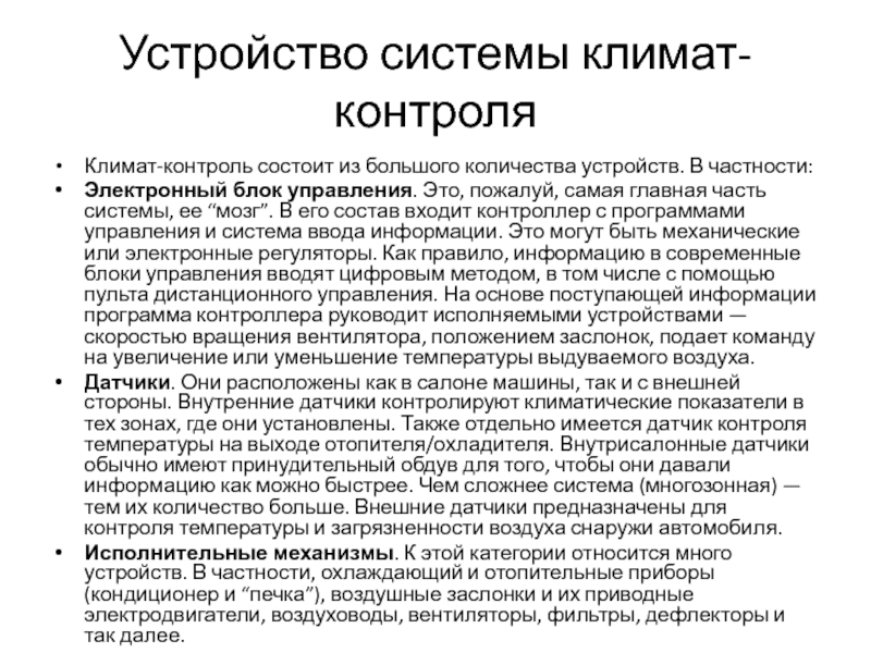 Исполнительные механизмы. К этой категории относится много устройств. В частности, охлаждающий и отопительные приборы (кондиционер и “печка”), воздушные заслонки и их приводные электродвигатели, воздуховоды, вентиляторы, фильтры, дефлекторы и так далее.