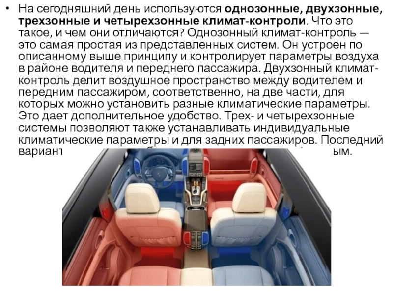 Слайд 6На сегодняшний день используются однозонные, двухзонные, трехзонные и четырехзонные климат-контроли. Что