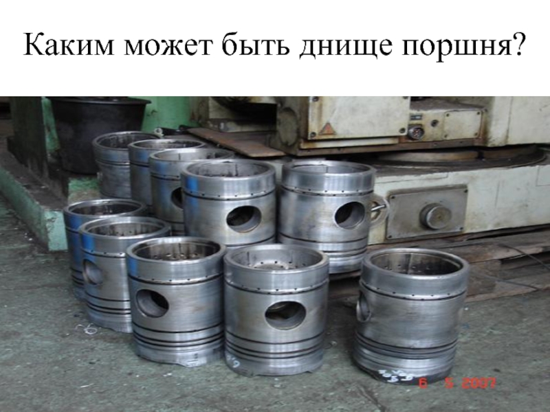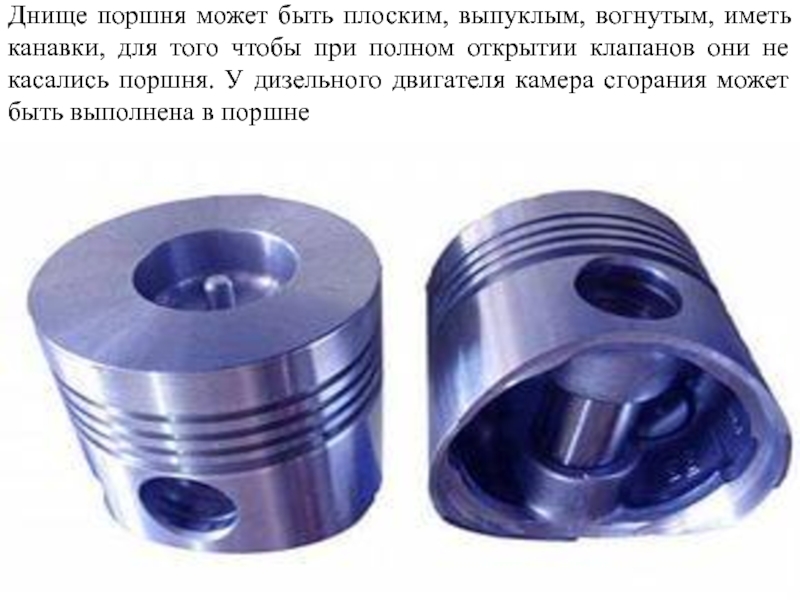 Слайд 41Днище поршня может быть плоским, выпуклым, вогнутым, иметь канавки, для