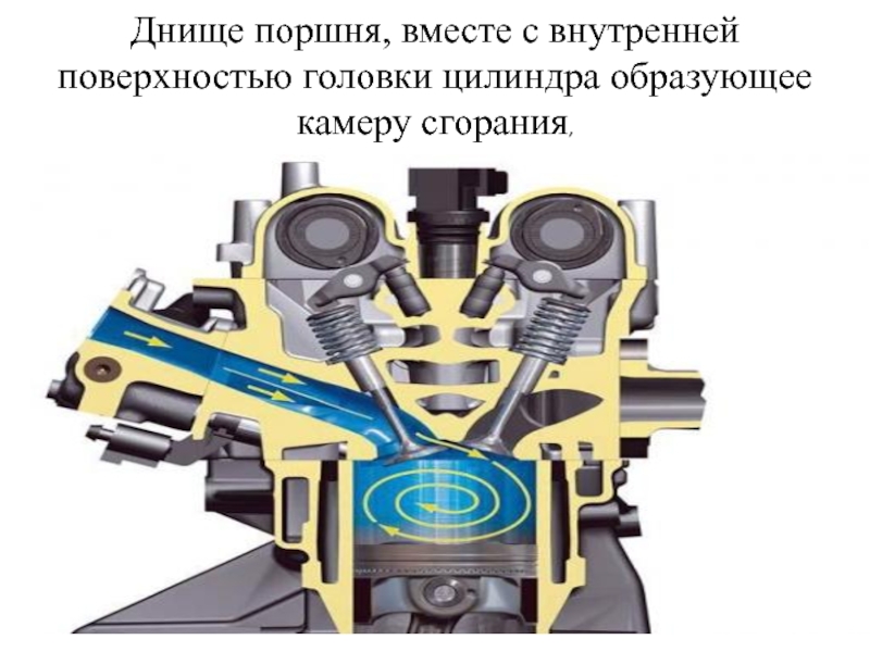Слайд 15Днище поршня, вместе с внутренней поверхностью головки цилиндра образующее камеру