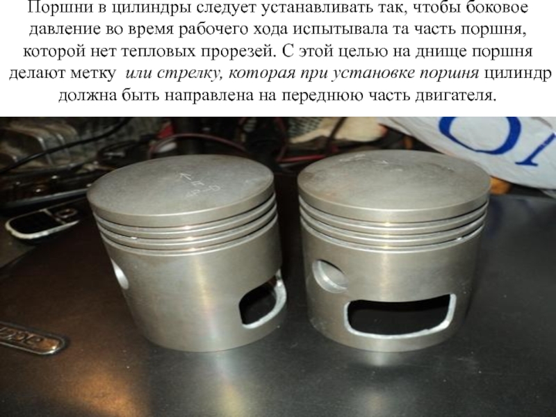 Слайд 39Поршни в цилиндры следует устанавливать так, чтобы боковое давление во