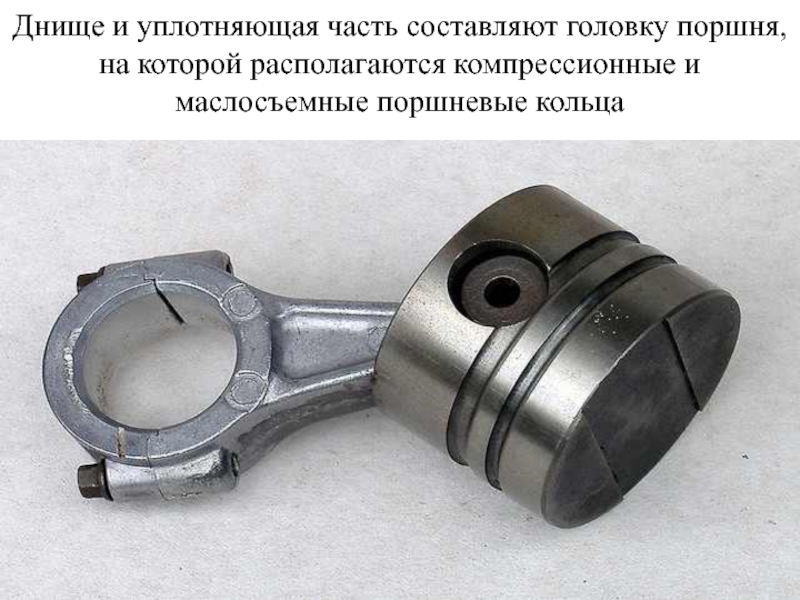 Слайд 19Днище и уплотняющая часть составляют головку поршня, на которой располагаются