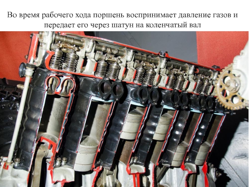 Слайд 9Во время рабочего хода поршень воспринимает давление газов и передает