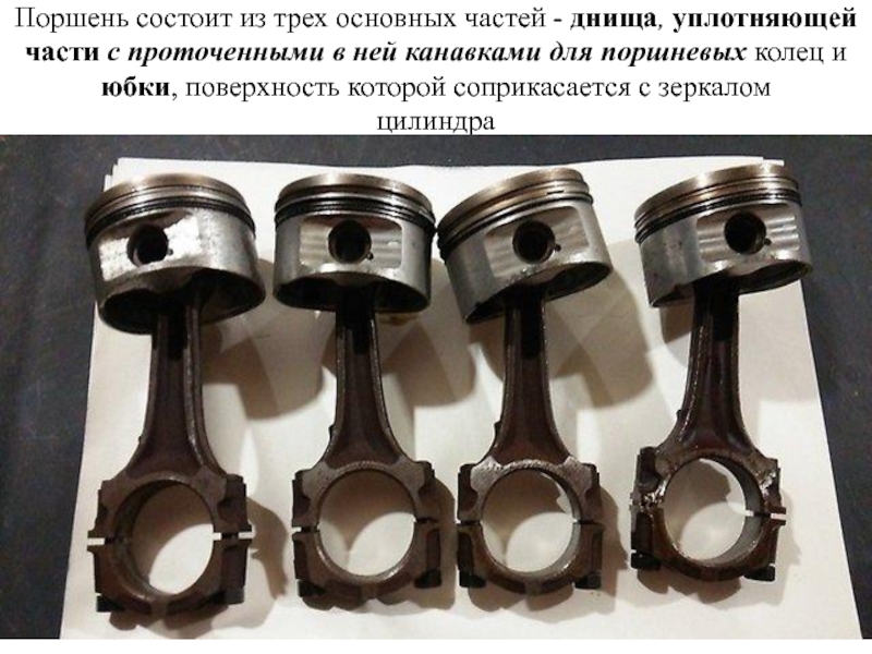 Слайд 7Поршень состоит из трех основных частей - днища, уплотняющей части