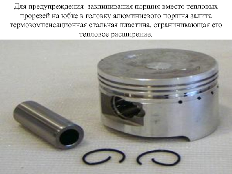 Слайд 28Для предупреждения заклинивания поршня вместо тепловых прорезей на юбке в