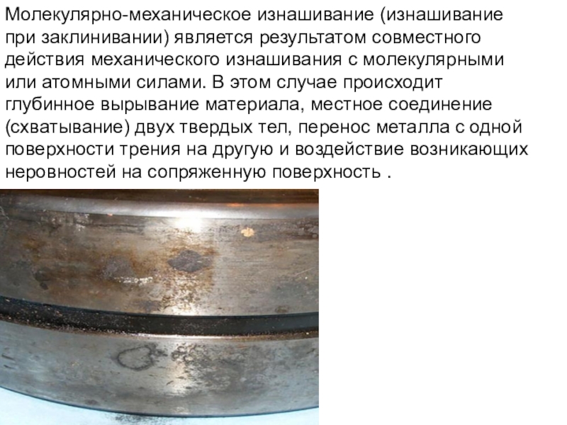 Слайд 64Молекулярно-механическое изнашивание (изнашивание при заклинивании) является результатом совместного действия механического