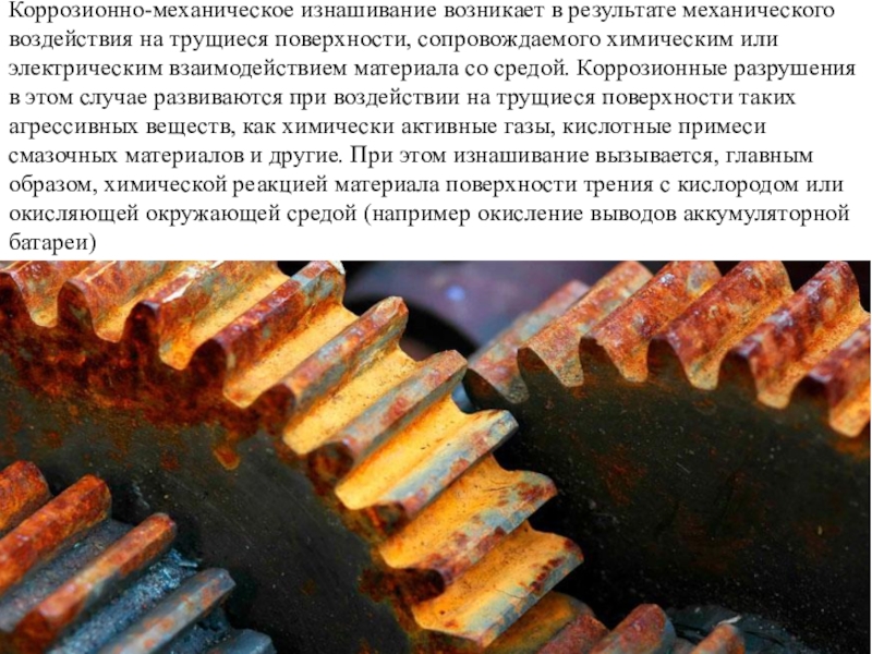 Слайд 65Коррозионно-механическое изнашивание возникает в результате механического воздействия на трущиеся поверхности,