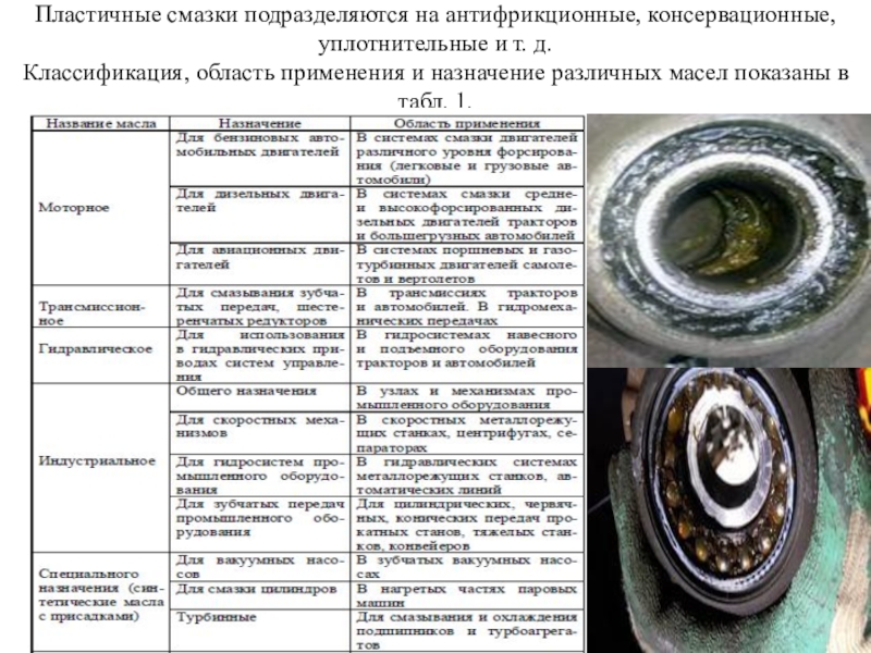 Классификация, область применения и назначение различных масел показаны в табл.