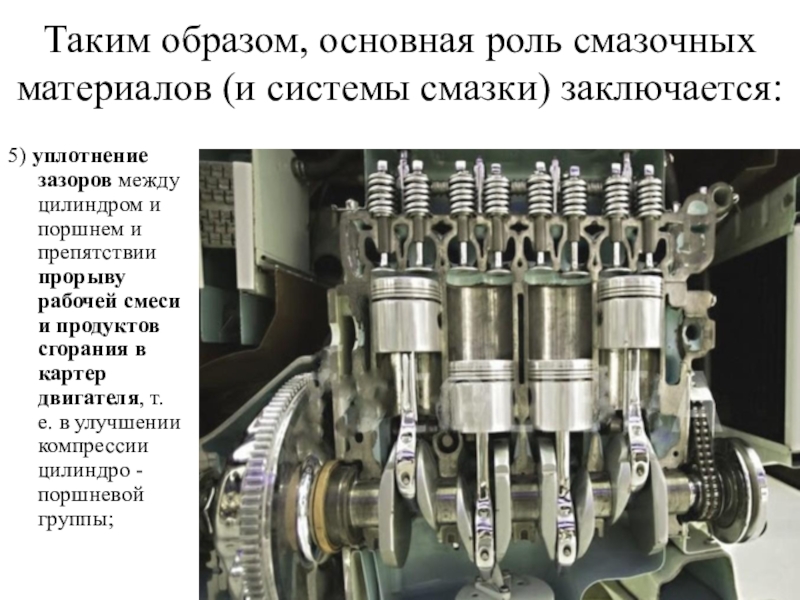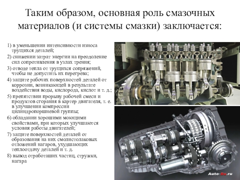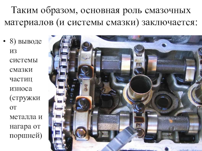 Слайд 8Таким образом, основная роль смазочных материалов (и системы смазки) заключается: