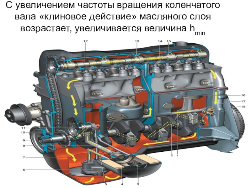Слайд 56С увеличением частоты вращения коленчатого вала «клиновое действие» масляного слоя