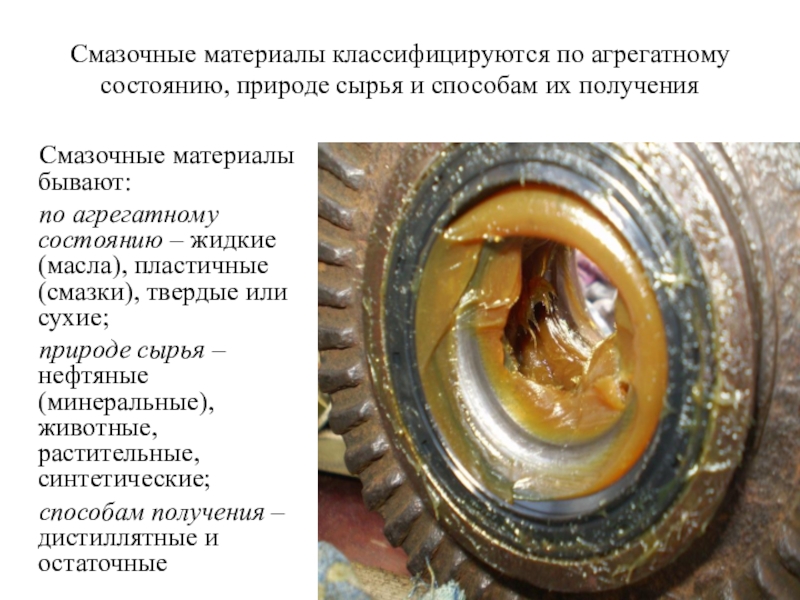 Слайд 16Смазочные материалы классифицируются по агрегатному состоянию, природе сырья и способам