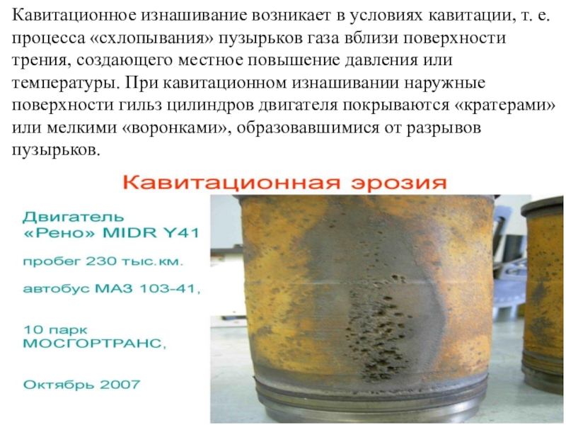 температуры. При кавитационном изнашивании наружные поверхности гильз цилиндров двигателя покрываются «кратерами» или мелкими «воронками», образовавшимися от разрывов пузырьков.