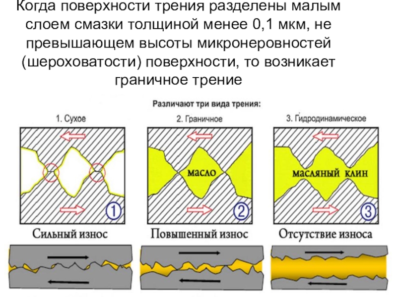 Слайд 50Когда поверхности трения разделены малым слоем смазки толщиной менее 0,1