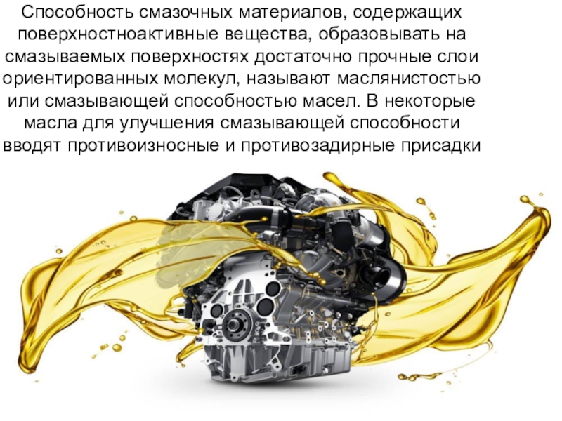 Слайд 52Способность смазочных материалов, содержащих поверхностноактивные вещества, образовывать на смазываемых поверхностях