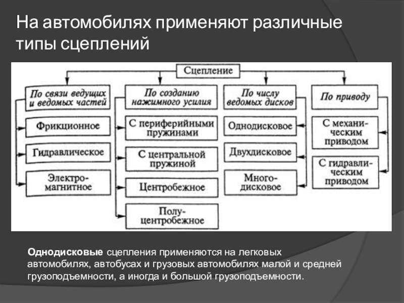 Слайд 4На автомобилях применяют различные типы сцеплений